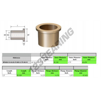 The Oil Filled Flanged Bronze Bush known by the reference BFAI38.10-44.45-47.625-3.175-38.10 Generic has an inside diameter of 38.1 mm, an outside diameter of 44.45 mm and a length of 38.1 mm. It is manufactured in .