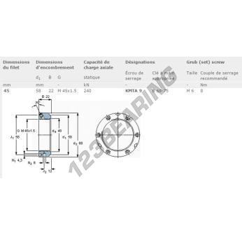 This lock nut KMTA9-SKF with an inside diameter of 45mm, an outside diameter of 58mm and a thickness of 22mm.