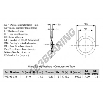 The Wave Spring Washers- Compression Type with the reference W2795031 has an inner diameter of 61 mm, an outer diameter of 71 mm and a thickness of 0.8 mm. It is made of STEEL.