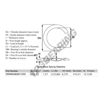 The Split Wave Spring Washer with the reference SWSW-410.010-382.820-1.070-10-SS has an inner diameter of 382.82 mm and a thickness of 1.07 mm. It is made of STAINLESS STEEL.