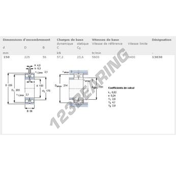 The Self Aligning Ball Bearing, known as 13030-SKF SKF, has an inner diameter of 150 mm, an outer diameter of 225 mm and a thickness of 56 mm.