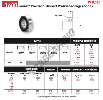 The Deep Groove Ball Bearing, known as 1623-DC-NICE NICE, has an inner diameter of 15.875 mm, an outer diameter of 34.925 mm and a thickness of 11.113 mm.