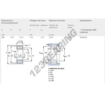 The Deep Groove Ball Bearing, known as 3218-A-SKF from the brand SKF, has an inner diameter of 90 mm, an outer diameter of 160 mm and a thickness of 52.4 mm.