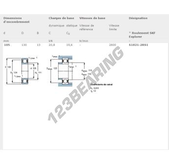 The Deep Groove Ball Bearing, known as 61821-2RS-SKF SKF, has an inner diameter of 105 mm, an outer diameter of 130 mm and a thickness of 13 mm.