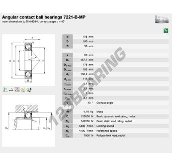 The Deep Groove Ball Bearing, known as 7221-B-MP-FAG FAG, has an inner diameter of 105 mm, an outer diameter of 190 mm and a thickness of 36 mm.