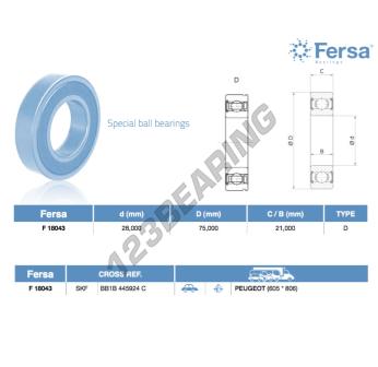 The Deep Groove Ball Bearing, known as F18043-ASFERSA from the brand ASFERSA, has an inner diameter of 28 mm, an outer diameter of 75 mm and a thickness of 21 mm.