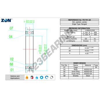 The Deep Groove Ball Bearing, known as F61701-ZZ-ZEN ZEN, has an inner diameter of 12 mm, an outer diameter of 18 mm and a thickness of 4 mm.