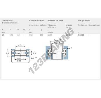 The Thrust Ball Bearing, known as 52218-SKF SKF, has an inner diameter of 75 mm, an outer diameter of 135 mm and a thickness of 62 mm.