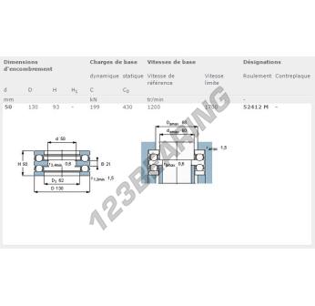 The Thrust Ball Bearing, known as 52412-M-SKF SKF, has an inner diameter of 50 mm, an outer diameter of 130 mm and a thickness of 93 mm.