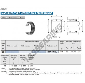 The Needle Roller Bearing, known as RNA6910-U-IKO IKO, has an inner diameter of 58 mm, an outer diameter of 72 mm and a thickness of 40 mm.