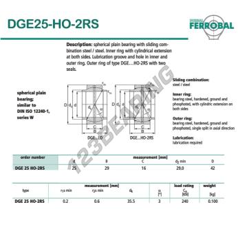 The Rod End Ge known as DGE25-HO-2RS-DURBAL DURBAL has an inside diameter of 25 mm, an outside diameter of 42 mm and a thickness of 16 mm.