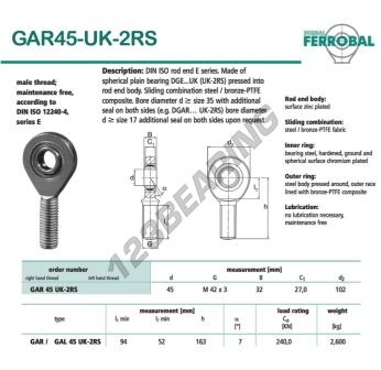 The Rod End Ge known as GAR45-UK-2RS-DURBAL DURBAL has an inside diameter of 45 mm, an outside diameter of 102 mm and a thickness of 32 mm.
