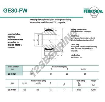 The Rod End Geew known as DGE30-FW-DURBAL DURBAL has an inside diameter of 30 mm, an outside diameter of 55 mm and a thickness of 20 mm.