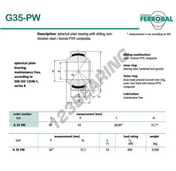 The Rod End Geew known as G35-PW-DURBAL DURBAL has an inside diameter of 35 mm, an outside diameter of 62 mm and a thickness of 28 mm.