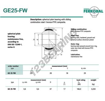 The Rod End Geew known as GE25-FW-DURBAL DURBAL has an inside diameter of 25 mm, an outside diameter of 47 mm and a thickness of 18 mm.