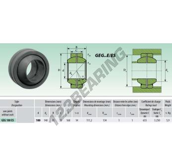 The Rod End Geg known as GEG100-ES Generic has an inside diameter of 100 mm, an outside diameter of 160 mm and a thickness of 85 mm.
