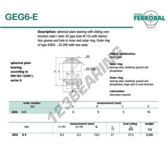 The Rod End Geg known as GEG6-E-DURBAL DURBAL has an inside diameter of 6 mm, an outside diameter of 16 mm and a thickness of 5 mm.
