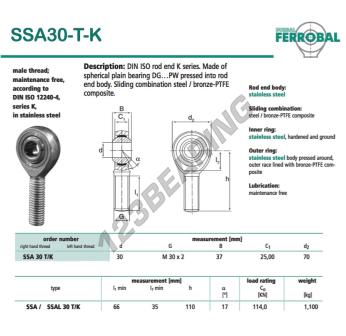The Rod End Sa known as DSSA30-T-K-DURBAL DURBAL has a screw thread of , an inner diameter of 30 mm, an outer diameter of 70 mm and a thickness of 37 mm.