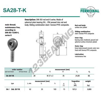 The Rod End Sa known as SA28-T-K-DURBAL DURBAL has a screw thread of , an inner diameter of 28 mm, an outer diameter of 66 mm and a thickness of 35 mm.