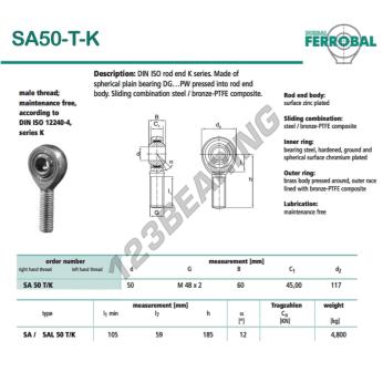 The Rod End Sa known as SA50-T-K-DURBAL DURBAL has a screw thread of , an inner diameter of 50 mm, an outer diameter of 117 mm and a thickness of 60 mm.