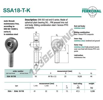 The Rod End Sa known as SSA18-T-K-DURBAL DURBAL has a screw thread of , an inner diameter of 18 mm, an outer diameter of 44 mm and a thickness of 23 mm.