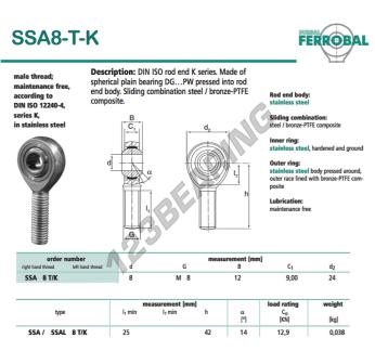 The Rod End Sa known as SSA8-T-K-DURBAL DURBAL has a screw thread of , an inner diameter of 8 mm, an outer diameter of 24 mm and a thickness of 12 mm.