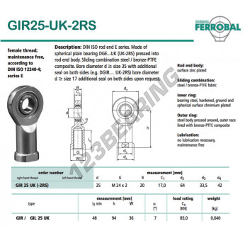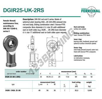 The Rod End Si known as DGIR25-UK-2RS-DURBAL DURBAL has an inside diameter of 25 mm, an outside diameter of 64 mm and a thickness of 20 mm.