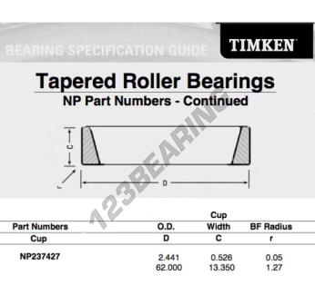 The Raw Cup, known as NP237427-TIMKEN TIMKEN, has an inner diameter of mm, an outer diameter of 62 mm and a thickness of 13.35 mm.