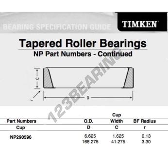 The Raw Cup, known as NP290596-TIMKEN TIMKEN, has an inner diameter of mm, an outer diameter of 168.275 mm and a thickness of 41.275 mm.