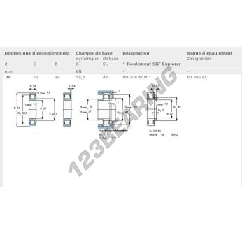 The Roller Bearing, known as NU306-ECM-SKF SKF, has an inner diameter of 30 mm, an outer diameter of 72 mm and a thickness of 19 mm.