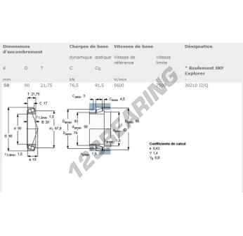 The Tapered Roller Bearing, known as 30210-J2-Q-SKF SKF, has an inner diameter of 50 mm, an outer diameter of 90 mm and a thickness of 21.75 mm.