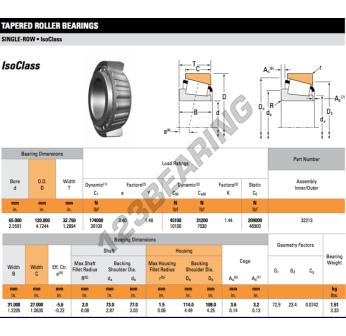 The Tapered Roller Bearing, known as 32213-TIMKEN TIMKEN, has an inner diameter of 65 mm, an outer diameter of 120 mm and a thickness of 32.75 mm.