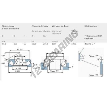 The Thrust Roller Bearing, known as 29330-E-SKF SKF, has an inner diameter of 150 mm, an outer diameter of 250 mm and a thickness of 60 mm.