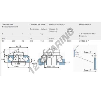 The Thrust Roller Bearing, known as 29412-E-SKF SKF, has an inner diameter of 60 mm, an outer diameter of 130 mm and a thickness of 42 mm.